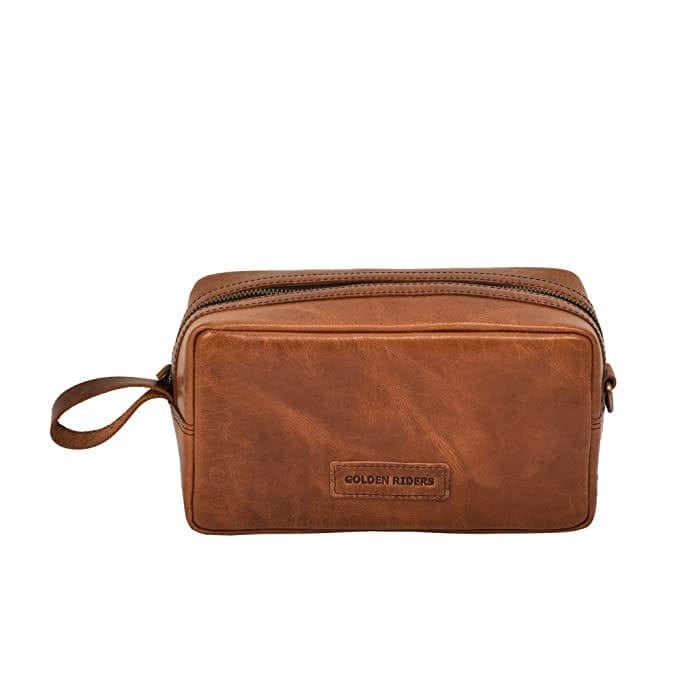- GOLDEN RIDERS Genuine Natural Leather Shaving/Toiletry Handy Pouch: Specifically handcrafted the traditional way, to make it more handy & spacious at same time. Premium leather, natural cotton lining & YKK zippers not only add additional life to pouch, even it gets better with usage.