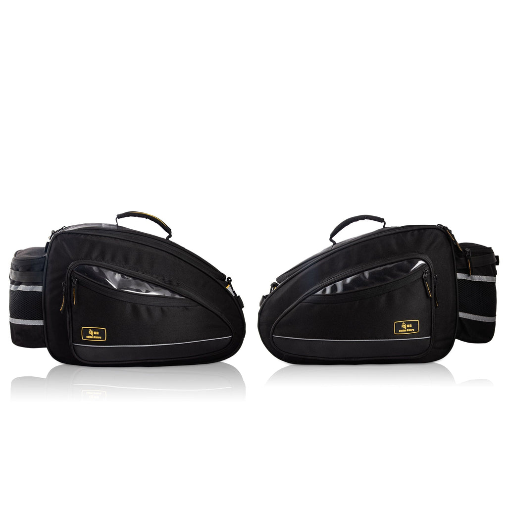 GR Golden Riders Saddle Bag (Set of 2) Upgrade your biking experience with the GR Golden Riders Saddle Bag, a set of 2 durable and stylish bags designed for ultimate convenience and practicality. Design and Build: The saddle bags feature a 2-sided foster design, providing ample storage space on both sides of your bike. Crafted from high-quality, weather-resistant materials to ensure durability and longevity, even in tough riding conditions. Compatibility: Engineered to fit a wide range of bikes, these saddle bags can be easily attached to most bike models, making them a versatile choice for any rider. Features: Spacious compartments allow you to carry essential items, from tools and gear to personal belongings, securely and comfortably. The bags are equipped with sturdy zippers and secure fastening systems to keep your items safe during rides. Reflective strips on the bags enhance visibility, adding an extra layer of safety during night rides or low-light conditions. Bag capacity is 61L